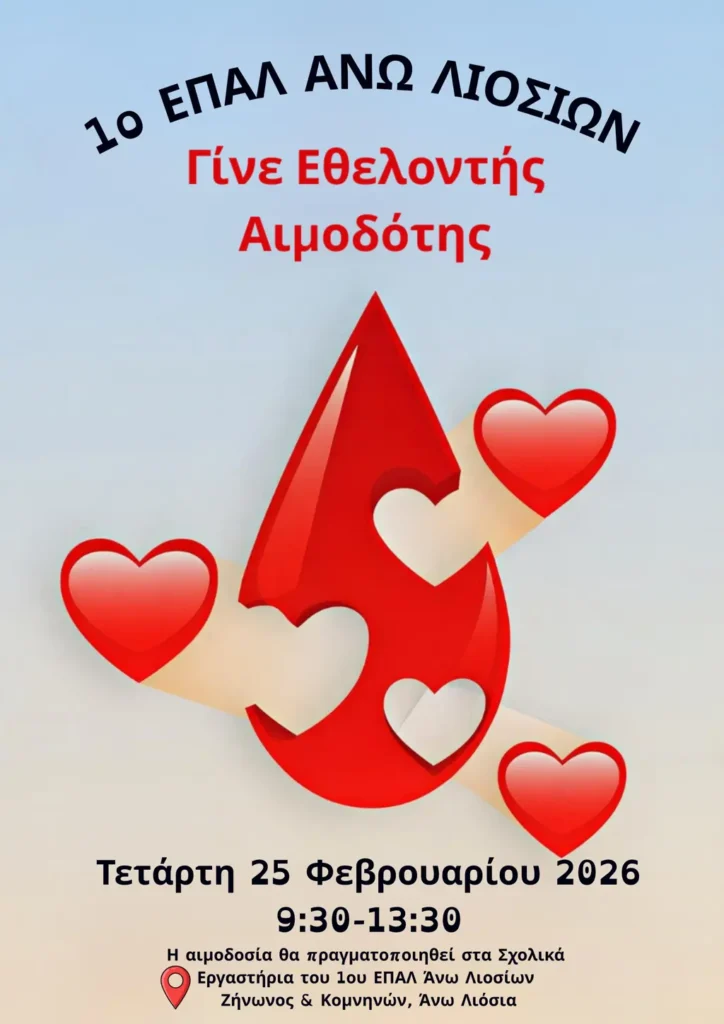 Σας προσκαλούμε στην 23η Εθελοντική Αιμοδοσία για την Τράπεζα Αίματος του ΕΠΑΛ Άνω Λιοσίων.